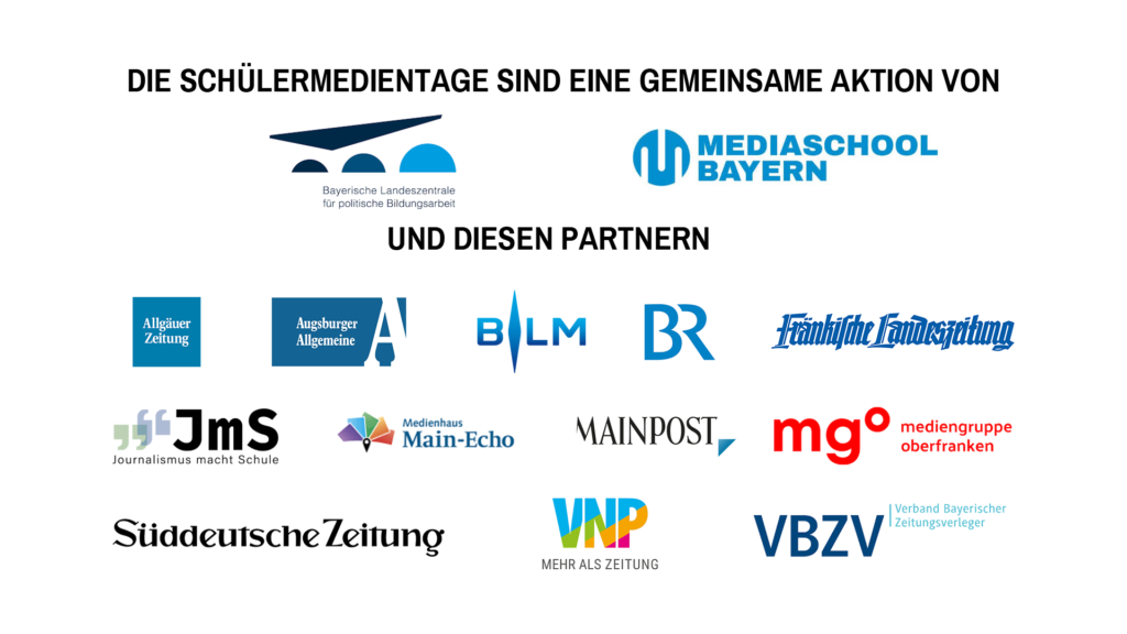 Die Bayerische Landeszentrale für politische Bildungsarbeit organisiert gemeinsam mit allen Partnern die Schülermedientage. Sie hat laut Gesetz die Aufgabe, auf überparteilicher Grundlage das Gedankengut der freiheitlich-demokratischen Staatsordnung zu fördern. In zahlreichen Formaten, auch für Schülerinnen und Schüler, will sie deshalb u.a. über Demokratie, Werte und politische Herausforderungen informieren und mit möglichst vielen interessierten Menschen diskutieren.
